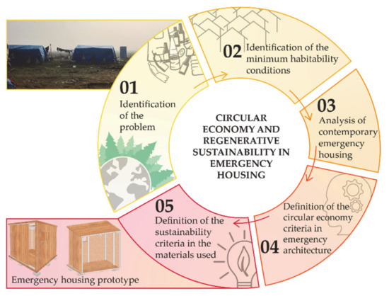 The previous points will conclude in the prototype proposal which will compile the conclusions obtained at each stage, thus accomplishing the objective of the research, to propose an eco-efficient prototype for emergency housing, from the point of view of circular economy and regenerative sustainability, that can respond to situations of natural or humanitarian disasters in different locations. This methodology workflow has a qualitative approach, and not quantitative, due to the fact that no calculation software has been used to measure the results.