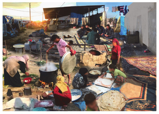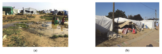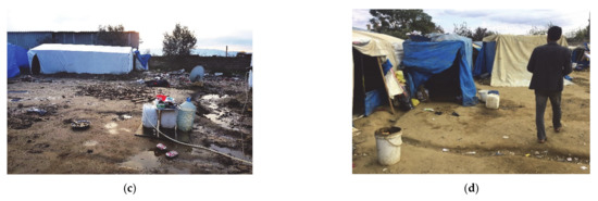 An on-site survey of the characteristics of the dwellings of the inhabitants of this settlement was carried out. They are built on the basis of a removable galvanized steel structure of tubular profiles that form a gable roof, without a firm and solid anchor to the ground, on which they place fabrics, blankets, and plastics in the form of an envelope that serve as little protection. Several of these accommodations have wooden pallets on the ground to slightly raise the floor and avoid the water that enters when the plot is flooded, since the interior and exterior floors of the home are at the same level. These lodgings have a single rectangular space without interior divisions of about 7 m2 with a single passage opening that gives access to the interior, which hinders the independence and family life of its users. A few of these accommodations have an opening in the roof to facilitate ventilation when cooking inside. In addition, these homes do not have any type of access to water or electricity. In the following photographs, the general characteristics of Subaşi location and habitability are displayed (Figure 6), and in the collage (Figure 7), the lifestyle of its inhabitants is shown.