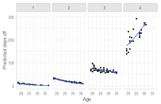 Association of age with predicted days off at four severity levels (1: mild; 2: moderate; 3: severe; 4: very severe).