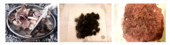 In this study, the animal bones, which were collected from disposals, were cleaned in order to partially separate them from the flesh, tissues and fats. In a next stage, they were heated in 92 °C in order to achieve the complete separation of any remaining flesh, tissue or fat that was still on the bone. Then, the dried bones were crushed in a jaw crusher in order to achieve the aggregate sizes needed for concrete aggregates (Figure 1a). The human hair samples, and more specifically men’s hair that had not been dyed were collected from the waste of a barbershop, and they were washed with acetone and air-dried before being included in the design concrete mix (Figure 1b). It should be mentioned that the human hair which was used and modified in this experimental study would not be necessary for any historical, medical or social application. Throughout the process of mixing the concrete components, the total volume of the human hair was placed periodically and in equal parts. Moreover, the mixing time was doubled in order to achieve the homogeneity in their distribution as well as in order to prevent the formation of agglomerates. The latter was incorporated into the volume of the produced concrete, where it was uniformly ensured that it was the first component added into the mixer when mixing the raw materials of the concrete. The concentration of human hair samples (length up to 15 mm) was 1.5% per volume, as it has been proven many times that this concentration is the optimum one [52]. Moreover, in the present study, we performed additional modification of human hair’s microtopography where locally increasing its microtopography by using resinous quartz primer (Figure 1c).