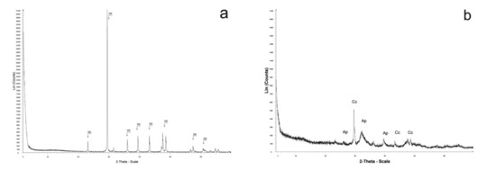 X-ray diffraction pattern of: (a) limestone; (b) goat’s bone (Cc: calcite, Ap: apatite).