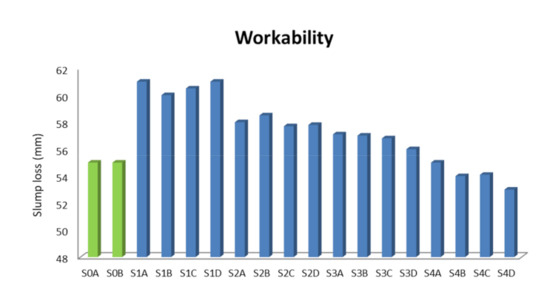 Chart of the workability of the concrete specimens (with the green color representing the reference concrete specimens).
