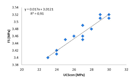 Uniaxial compressive strength (UCScon (MPa)) vs. the flexural strength (Fs (MPa)) of the produced concrete specimens.