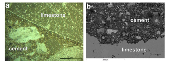 (a) Photomicrograph (sample SOA) and (b) secondary electron image (sample SOB) showing reference tested concretes with good cohesion between limestone aggregate grains and cement paste.
