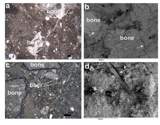 Photomicrographs of representative tested concretes showing: (a) animal bone aggregates (parallel nicols, sample S1A); (b) animal bone aggregates (sample S1B); (c) animal bone aggregates coating with quartz primer and human hair fibers (crossed nicols, sample S2A). Back scattered electron images showing microstructures at the interface between cement paste; (d) human hair fiber (sample S2B).