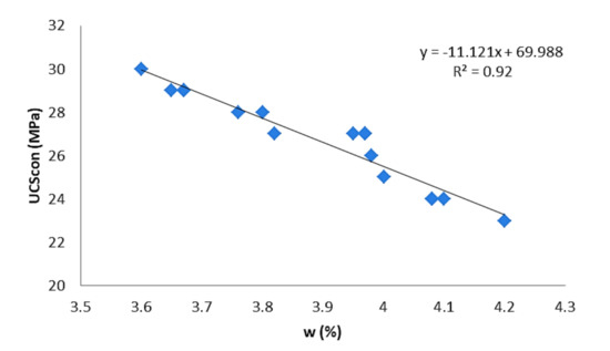Moisture content (w (%)) of animal bones vs. the uniaxial compressive strength (UCScon (MPa)) of the produced concrete specimens.