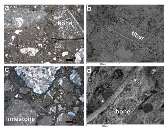 Photomicrographs of representative tested concretes showing: (a) animal bone aggregates and human hair fiber coating with quartz primer (parallel nicols, sample S3A); (b) human hair fiber coating with quartz primer (sample S3B); (c) animal bone aggregates and human hair fibers coating with quartz primer, as well as limestone aggregates (crossed nicols, sample S4A). Back scattered electron images showing microstructures at the interface between cement paste; (d) animal bone aggregate and human hair fiber coating with quartz primer (sample S4B).