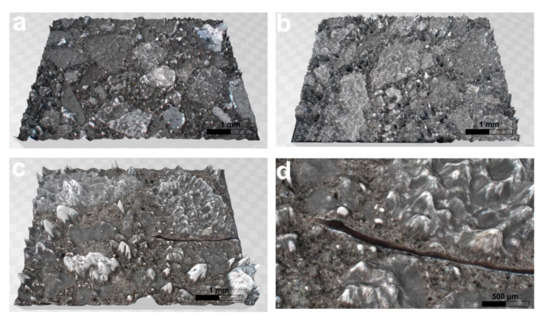 All the above are enhanced either through the processing of microscopic images after the 3D depiction or through the study of the transition zone between the aggregate and the cement paste as it is shown in Figure 10a–d. All bones seem to present satisfactory cohesion with the cement paste, which does not appear satisfactory enough as their microroughness increases. At this point, it is worth mentioning that the bones have similar microtopographical characteristics to those of other natural sedimentary aggregates, as has also been observed by the Petrounias et al. [72]. In addition, it is observed that although the hair has lower microroughness compared to that of the other components of the concrete, it seems that it gives the required cohesion.