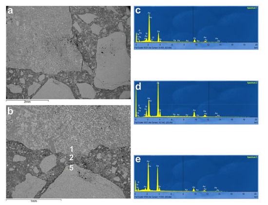 (a,b) Back scattered image of a concrete specimen; (c–e) SEM-EDX spectra from the interface of an aggregate particle with the cement paste from the spots 1, 2, 5 as shown in Figure 11b.