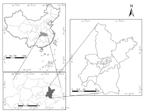 Wuhan is divided into 13 administrative districts, comprising Jiang’an District, Jianghan District, Qiaokou District, Hanyang District, Wuchang District, Qingshan District, Hongshan District, Caidian District, Jiangxia District, Huangpi District, Xinzhou District, Dongxihu District and Hannan District [26]. At the end of 2019, Wuhan had a total area of 8569.15 square kilometers and a population of 11.21 million, including 9.02 million urban residents, accounting for 80.49% of the total population [27].