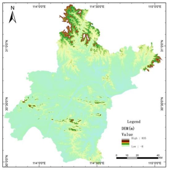 Wuhan is the capital of Hubei Province in central China (Figure 1). It is located in the east of Hubei Province, at the intersection of the Yangtze River and the Hanshui River. Its geographical location is 29°58′–31°22′ N and 113°41′–115°05′ E. The distance from the east to the west of Wuhan is 134 km, and it is about 155 km from the north to the south at its maximum extent. Wuhan is topographically flat in the central portion, surrounded by hills and ridges to the north and south, and low mountains to the north (Figure 2). The areas of low mountains, hills, ridges and elevated plains, and flat plains in the city, account for 5.8%, 12.3%, 42.6% and 39.3% of the total land area, respectively. The altitude ranges from 19.2 m to 873.7 m, but most of the area is below 50 m [26].
