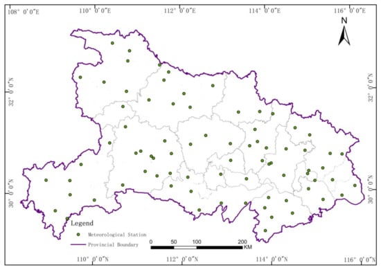 The meteorological data used in this paper were from 85 meteorological stations in Hubei Province (Figure 3). The data provided by each station were by day, including temperature, relative humidity, wind speed, rainfall and air pressure. Relevant studies have shown that there are correlations between meteorological factors, such as temperature, relative humidity, wind speed, and rainfall, and the morbidity of COVID-19 [24,25,30]. Therefore, the above four types of meteorological elements were taken as explanatory variables. In addition, considering the correlation of air pressure with other meteorological factors, these were also taken as explanatory variables. The ordinary Kriging spatial interpolation method is used to process the daily meteorological data, and the grid interpolation results of each meteorological element, with 500 m spatial resolution, were obtained. The average values of meteorological data by day and district were obtained using ArcGIS 10.4 software.