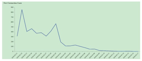 From 21 February 2020 to 17 March 2020, the time sequence of the number of newly confirmed cases in Wuhan is shown in Figure 4. According to this, the spread of COVID-19 in Wuhan can be divided into four stages. Stage A included 21 February and 22 February 2020, when COVID-19 was still in the outbreak period. At this time, the number of newly confirmed cases was still large, and it then rose sharply, reaching a peak on 22 February 2020. Stage B was from 23 February to 27 February 2020. At this stage, the government strengthened its control, which alleviated the spread of COVID-19 to a certain extent, and the number of newly confirmed cases fell sharply for a short time. Stage C included 28 February and 29 February 2020. At the end of February, the number of newly confirmed cases reached a peak again. Stage D was from 1 March to 17 March 2020. At the beginning of March, the epidemic situation was gradually alleviated with the intervention of human prevention and control measures. Newly confirmed cases continually go down in number.