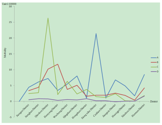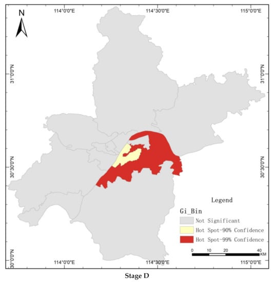 Based on the above global spatial autocorrelation analysis, the incidence rate of localized Getis–Ord hotspots was analyzed, and the visualized results are shown in Figure 6. During the whole study period, there are clustered areas, except in stage A. There are hotspots with high values in the city centers for most of the time, especially in Hongshan and Wuchang (Table 2). The incidence rate is strongly concentrated in stage B and stage D. In addition, strong randomness in stage C is shown, with rapidly increasing morbidity.