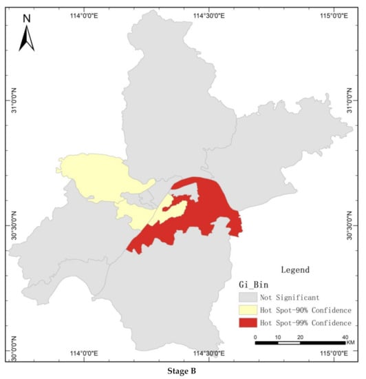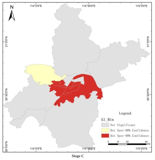 Local Getis–Ord of morbidity of COVID-19 in stage B, stage C and stage D in Wuhan.
