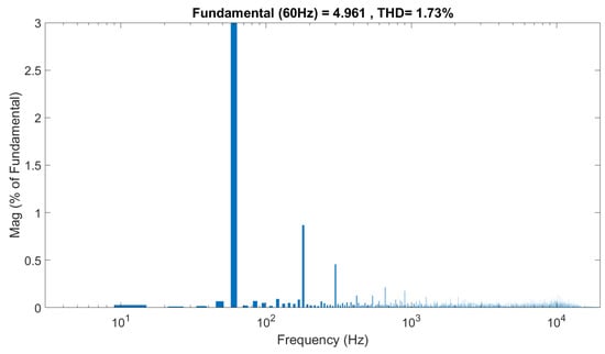 The effectiveness of the proposed controller in generating low-grid-current THD% is shown in Figure 3, where the THD% is 1.73%. This result is below the stated limit in IEEE 929-2000 standard for grid-connected PV systems (THD < 5%). The synchronization between the grid current and the grid voltage, the unity power factor, is shown in Figure 4. Additionally, the quality of the grid current is presented by plotting it against its reference.
