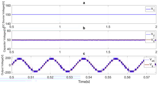 Figure 5 shows the DC voltage, , set as 150 V during the simulation. The capacitor voltage, , is maintained at around its reference, 50 V, as shown in the same figure. The mean error of is 0.44 V. The third part of Figure 5 shows the generated nine levels of the inverter, , with the grid voltage, . The results show the boosting ability of the CSC inverter, where the maximum voltage level (200 V) is the sum of the DC voltage and the capacitor voltage.