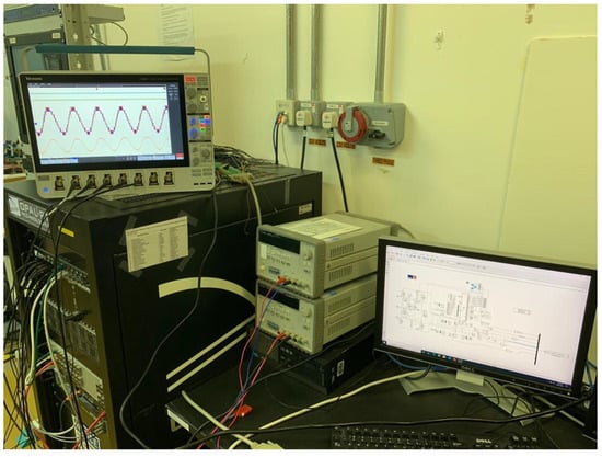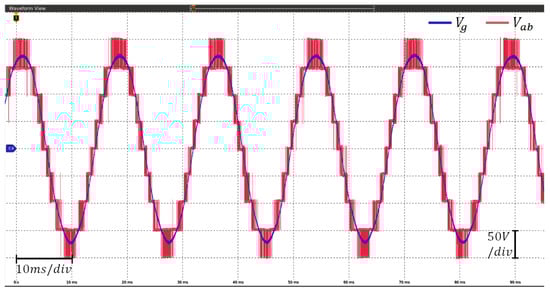 The setup of the system’s real-time implementation is shown in Figure 8. Figure 9, Figure 10 and Figure 11 demonstrate the steady-state operation of the system. The nine voltage levels of the CSC inverter () are shown in Figure 9 along with the grid voltage (). The MPC objective is to ensure that the generated grid current () follows its reference (). This is clearly shown in Figure 10. The phase angle that is used to generate the reference current signal () is obtained from the grid voltage signal. That is, the generated grid current () is synchronized with the grid voltage with unity power factor. This synchronization is demonstrated in Figure 11.