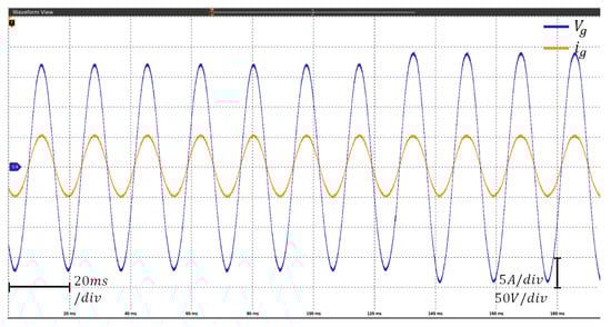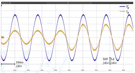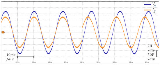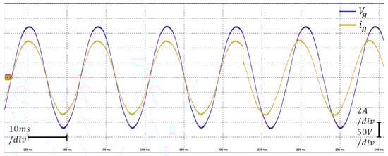 Reactive power variation was tested by introducing phase shift between the grid voltage and the grid current in two scenarios: and , as shown in Figure 18 and Figure 19, respectively.
