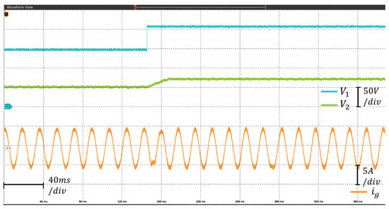 The real-time implementation of the proposed MPC was extended to include several dynamic variation tests. Figure 14 illustrates the dynamic performance during a step-up change in the current reference peak from 5 A to 10 A. The generated grid current followed the new reference and maintained the unity power factor. In the second dynamic test, the DC voltage source was increased by (40%), i.e., is increased from 150 V to 210 V. As shown in Figure 15, accommodated the changes and increased from 50 V to 70 V ( = /3).