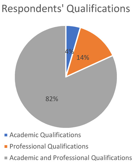 Based on the results from the questionnaire, it was determined that the technical nature of construction skills, the multidisciplinary and regulatory environment and the challenging working conditions made the role of PMs in the construction industry especially complicated. Based on the responses from the first survey question, it was determined that a large majority (82%) of the respondents had both academic and professional qualifications. 14% of the respondents only had professional qualifications, while 4% only had academic qualifications. These results are exemplified in Figure 2 below.