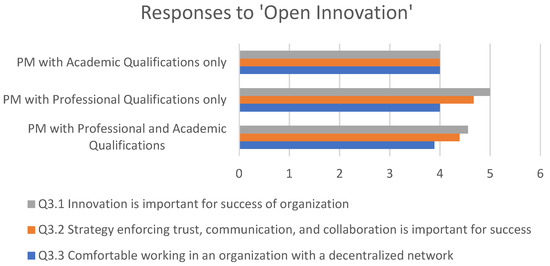 Based on the responses collected, PMs with professional and academic qualifications have a strong understanding of open innovations concepts and relevant mindsets. However, they were proven to have lower confidence when it came to working in a decentralized network environment. PMs only with professional qualifications presented the same responses, except for how they understood the importance of innovation even better. PMs only with academic qualifications also had similar responses to open innovation.