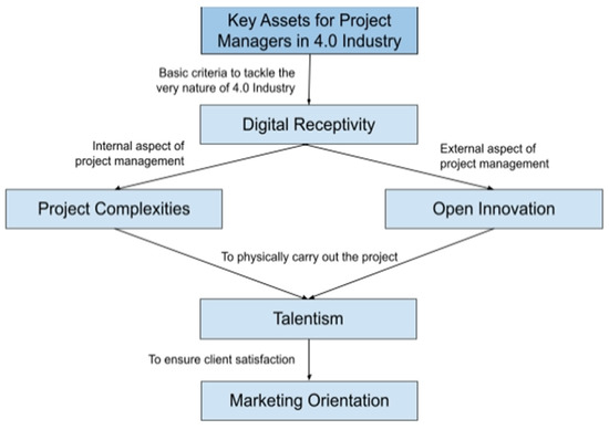 There is something of a consensus around the idea that digitalization triggered by new technological innovations must lead to a restructuring of the supply chain and a corollary (re)qualification of skilled workers (see especially [4,10,14]. As pointed out by several researchers, there will be new increasingly knowledge-intensive jobs created by these new I4.0 trends. In this paper, the assumed new skillset needed for I4.0 has been drawn from the literature and has been distilled into five categories: (1) marketing orientation, (2) open innovation, (3) complexity and (4) talentism, (5) digital receptivity. These specific skills are built upon each other to ensure that PMs can effectively handle all internal and external aspects required for PM. Digital receptivity forms the core of these assets to turn the organization towards I4.0 [61]. Together with digital receptivity, PMs must be able and prepared to handle the high level of project complexity and use and understand the importance of open innovation. These would target the internal and external aspects of PM, respectively. The multifaceted nature of the I4.0 projects would require the collaboration of various disciplines inside and outside the organization and tap into novel skills and ideas. Therefore, to manage the project well internally, PMs must have cross-disciplinary management capabilities to ensure the effective coordination of all required disciplines required to develop the product and increase its value. However, solely relying on the internal aspects of the organization is not enough to maximize product value. External collaboration with other organizations to synergize internal and external concepts, ideas and marketing methods, is also essential to ensure that product value is maximized to its full potential. Hence, PMs need to possess the open innovation skillset to collaborate externally with other organizations. It should be noted that while the coordination of such concepts and ideas is essential, without the talents of human capital, such concepts and ideas will not be able to come to fruition.