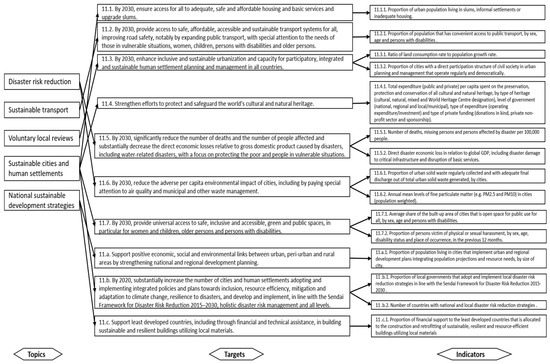 The United Nations estimate that the world population will increase by 32% in 2050 compared to 2015, from 7.2 to 9.7 billion inhabitants [3]. The UN also predicts that until 2030, over 60% of the world population is going to live in cities [4]. As a result, cities across the World will increasingly face the challenges to ensure the access to services with quality such as transportation, medical care, environment protection, and waste management, etc. Due to the major challenges that cities will face, one of the SDG focused specifically on cities which is SDG 11. SDG 11 aims to “make cities and human settlements inclusive, safe, resilient and sustainable” (https://www.globalgoals.org/11-sustainable-cities-and-communities, accessed on 28 March 2021). This step is perceived as reflecting an increased awareness of the important role that cities can play for global development pathways [5]. As stated in [6], “the battle for the SDGs will be won or lost in cities”. This research will focus on SDG 11 which has five topics, ten targets and 15 indicators, as shown in Figure 1.