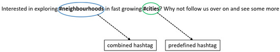 The combined hashtags are those used in the dataset and that are not in the list of the 99 hashtags. Since we aim to provide a better understanding about how SDG 11 discourse evolved over time, the predefined hashtags were not used in this analysis since we know that they are used in the 31,157 tweets. So, to detect new and trending “insights” about the SD11, we based our analysis on the “combined hashtags”. For example, as depicted in Figure 3, “#cities” is a predefined hashtag and “#neighbourhoods” is a combined hashtag.