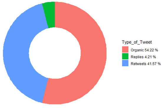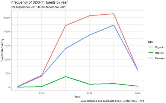 Figure 4 shows that the peak of tweets was reached in 2019. However, it has experienced a significant drop since the beginning of 2020. This could be explained by the global health crisis of COVID-19, which dramatically caught the interest of Internet users, including tweeters. This result confirms the theoretical and the empirical studies suggesting that since the beginning of 2020, COVID-19 has gained significant attention and has been on the top of social media trends including Twitter [63,64]. Figure 5 and Figure 6 show the rate of tweets, retweets, and replies and their evolution over time. We can observe that 54.2% of tweets are organic, 41.57% are retweets, and only 4.21% are replies. A high number of retweets indicates that the information about this subject is circulating rapidly on social media. A low number of replies may indicate that there are not well-developed interactions between the users on twitter for SDG 11. We observe that there is a high interest for the organic tweets with a ratio of 41.57% of retweets. This shows a high interest of people to tweets related to SDGs, which is aligned with the literature that states that Twitter is one of the main channels where people express this interest in the environment, society, and health [21,65].