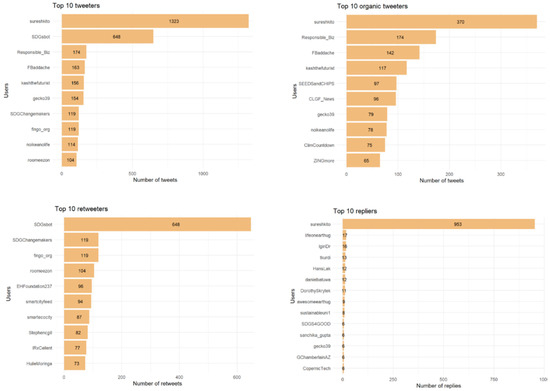 Finally, the top 10 repliers show that there is mainly one account very active to engage in discussion and replies to other tweets. This reflects the low number of replies compared to the organic tweets and retweets. We observe that the creators of tweets are individuals or non-UN representatives than UN bodies and representatives. It may be positive if the UN and the official government representatives are more active to tweet about SDG 11 to create a momentum of discussion around this goal for education and awareness purposes. This recommendation is supported by Domínguez et al. in [66] who studied the extent to which Twitter could be a tool to raise the awareness and educate people to improve cities’ living conditions towards more active and sustainable post-covid cities. The authors identified the top ten influential and active accounts, and show that there is a “new conscious audience” that could be more aware about social, economic, and environmental issues and concerns through Twitter active users. The study also shows that educational institutions, local organizations, NGOs, neighborhood associations, and individual accounts could raise the public awareness about local issues when they are more active. This observation of Dominguez et al., supports our recommendation that UN bodies and governmental institutions need to be more active on Twitter regarding SDGs.