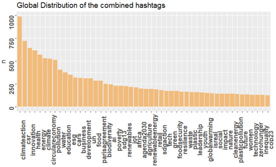 Pilař et al. in [65] analyzed the discourse related to sustainability published in Twitter with the aim to identify the main topics through hashtags significations. The key hashtags that they identified refer to innovation, climate change, corporate social responsibility, technology and energy. These findings fit almost with our results, as the key hashtags that we identified in our dataset are related also to climate change, csr, technology and energy. However, we identified other key hashtags that refer to health and food security. Regarding the list of the most frequent hashtags retrieved in [65], there are numerous hashtags that we eliminated from our dataset, as we consider them as general and could be useful for filtering and classification purpose, such as #sustainability, #sdgs and #globalgoals. In addition, our study considers the sustainable development goals with a focus on SDG 11, so it could be understood that we have key hashtags (i.e., like health, education, leadership, etc.) which refer mainly to public services or local issues in cities that could be not identified in more general studies. Moreover, Kumar et al. in [67] suggest that cities are playing an important role in the environmental development and that they could have a major contribution on climate change. In our study, as the hashtag “#climate action” is the most frequent, we believe that more local consideration toward climate change is needed in urban planning to ensure the sustainability of cities which could contribute on the global sustainability [17,30].