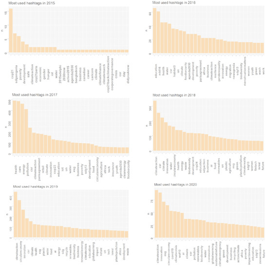 Figure 9 investigates the evolution of the trends over time to observe how the discourse evolved over time around SDG 11. We observe that there are specific hashtags that we can find each year such as #CSR, #climatereaction, or #innovation. However, we observe other hashtags that were used only for a specific year such as the hashtag #cop21 in 2015 since it was the year when the Paris Conference on Climate Change took place. We also observe the importance of hashtags related to artificial intelligence, IoT, or innovation that have been attracting more and more attention when talking about cities. For example, the hashtag AI, which ranked 15th in 2018, continued to grow to take the 8th place in 2020.