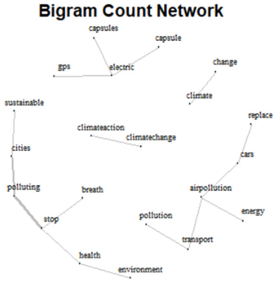 Our findings are consistent with previous research in the field. Domínguez et al. in [66] found that some Twitter influencers suggest the use of train instead of car, and pedestrianize the downtowns of cities in order to reduce gas emissions of cars. They suggested also reducing the use of cars on short trips, promoting walking and running for these trips. In the same vein, Bagliani et al. in [72] reported that transport, gas emissions and non-renewable energies are the main causes of air pollution. They advocated that the use of renewable energies could be a significant opportunity to achieve sustainability. Furthermore, Labonte and Rowlands in [68] studied Twitter-based conversations regarding energy issues and politics and showed, as we did in this study, that energy is linked with economic and environmental issues. Finally, Hamed and Zia in [73] used bigrams to analyze the climate change related discourse on Twitter and found that climate action and climate change are directly connected (as we depicted in Figure 11), and that pollution is linked to cities.