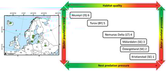The combination of past legacies and current land management regimes in Europe has created regionally specific ecological, economic and socio-cultural contexts. This can be used as a ‘time machine’ [39,40,41] to help understand the effects human society has on the patterns and processes of ecosystems. The diversity in land use history within the European continent thus provides ample opportunity for replicated studies in wet grasslands with different landscape–predator–prey relationships [42]. However, studies exploring the effects of predation on wet grassland wader birds that use multi-scale analysis of patch, landscape and regions are largely missing.