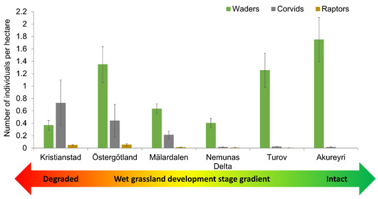 Mean number of waders, corvids and raptors observed per hectare for the six case study wet grassland landscapes in northern Europe (see Figure 1).