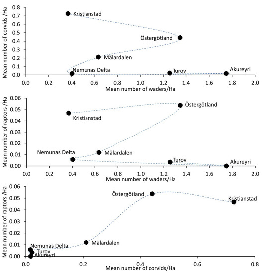 In general, nest predation is cited as the major cause of most nest failures and as a major constraint of successful wader bird breeding [92]. Predation as a factor behind breeding wader decline indeed calls for macroecological studies that trade off the precision of small-scale research of local habitat patches with a spatial scale that reflects regional landscape development stages [52]. For example, breeding waders typically utilise local homogenous patches, while corvid birds and especially raptors utilise entire landscapes containing a mixture of land cover mosaics. This also applies to mammal predators. Thus, similar macroecological studies which investigate the roles of mammal predators are needed.