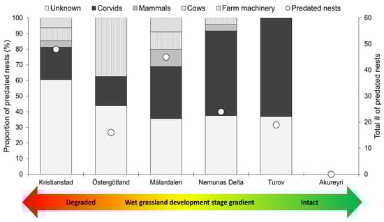 Proportions of the artificial ground nests preyed upon divided by the reasons for loss of artificial nests (bars and left vertical axis) and the total predation number in northern Europe (point and right vertical axis) (see Figure 1). Note: the nest predation experiment failed in Akureyri.