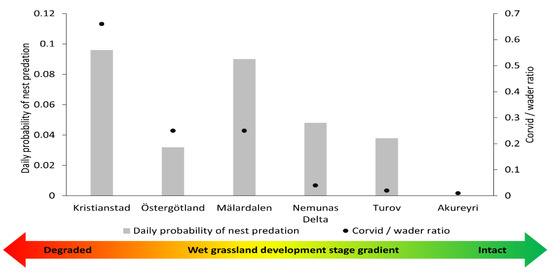 Our effort to apply a macroecological approach to explore the role of nest predation for sustaining viable populations of wader birds demonstrated clear differences among the wet grassland landscapes studied across Europe. First, while wader bird species richness was similar across the six landscapes, we found an inverse relationship between the mean number of observations of waders and corvid predators, as well as between the number of wader and corvid individuals. The relative abundance of corvid predators to waders decreased along the developmental stage gradient of wet grassland landscapes from emerging (Iceland) to functioning (Belarus) to degraded (Sweden).