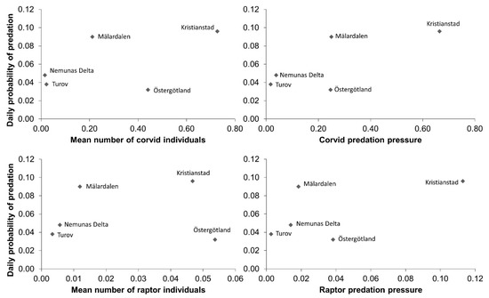 The relationship between corvid birds (top) and raptors (bottom) using mean number of individuals per hectare (left) and an estimate of predation pressure (right) and the daily probability of nest predation for the five study areas where the artificial nest experiments were conducted in northern Europe (Kristianstad, Östergötland, Mälardalen, Nemunas Delta and Turov; see Figure 1). Note: as the nest predation experiment failed in Akureyri, it was not plotted.