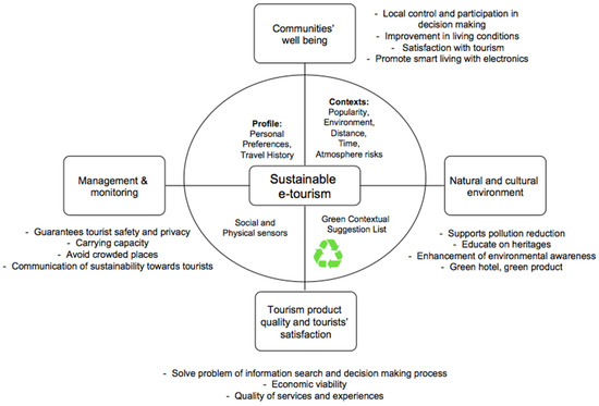 The repositories include the contexts, social and physical sensors, tourist’s profile, and green contextual suggestion list. With improved systems, sustainable e-tourism utilizes the technology to maximize efficiency and effectiveness while applying sustainable principles in tourism. The sustainability principles refer to the environmental, economic, and socio-cultural aspects of tourism development and a suitable balance must be established between these three dimensions to guarantee its long-term sustainability [13,14,15]. Four clusters serve as the criteria to achieve a sustainable e-tourism, namely, they are communities’ well-being, natural and cultural environment, tourism product quality and tourists’ satisfaction, and management and monitoring. Through the mediation of ICT, contextual suggestion and recommendation systems will significantly contribute to SDG 11 for the smarter and greener cities from which not only residents, but also tourists can benefit [16]. This will also facilitate further sustainable industrialization, necessary for economic growth, development, and innovation. Therefore, innovation and green infrastructure development in the e-tourism industry will significantly contribute towards SDG 9 for sustainable e-tourism [6] that can provide tourists with smart experiences enriched by real-time data that smart cities offer, with context awareness and personalization.