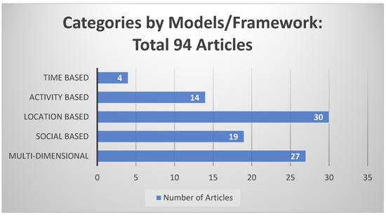Model/framework is one of the methods of effective research that consists of real or abstract forms such as mathematical models. The combinations of mathematical models are called approaches in previous studies. The model/framework in the present review is further divided into five categories. Time-based frameworks [58,59,60,61] were incorporated with temporal information. Activity-based [12,62,63,64,65,66,168,169,170,171,172,173,174,175] and location-based ones utilized the tourists’ geographic position via GPS to facilitate the tourists’ travel in an unfamiliar area. Social-based considered social-based constructs and effectiveness, and multi-dimension is a combination of all the approaches.
