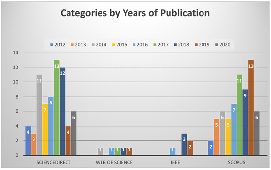 The 1006 articles obtained from the four databases through separate query search were classified as follows: 711 from Science Direct, 25 from IEEE Explore, 10 from Web of Science (WoS), and 313 from Scopus. Figure 3 shows the bar chart based on the number of articles in different categories in the digital databases. These articles were categorized according to the field of study. Figure 4 shows the number of articles based on sub-categories of the model/framework. Figure 5 shows the yearly development and increasing trend for this field of research from 2012 to 2020. After skimming the titles and abstracts, 268 articles and 5 records were removed owing to duplication. Full-text reading omitted 120 articles, leaving 143 articles as the ultimate set. The 120 articles are eliminated based on the exclusion criteria if the recommendation system is concerned with e-commerce and subscription-based services as these criteria are out of the scope of this paper. These selected 143 articles were read carefully to discover a general gap leading to the recommendation and contextual suggestion systems in e-tourism. These outlines captured the common classifications of research articles and then refined the literature classification. Figure 6 shows that several subclasses could be distinguished in the main layers. The following sections list the determined classifications, constructing simple indicators throughout the discussion.