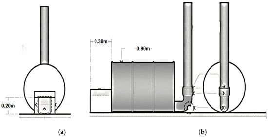 Four common agricultural residues in central Thailand, namely CC, CS, CH, and RS were used in this study. CC was obtained from a local market and was sun dried. The rest were obtained from the fields and used as received. A horizontal drum kiln with a capacity of 0.2 m3 at the Center for Energy and Environmental Engineering, Kasetsart University, Kamphaeng Saen campus, was used to produce the biochar. The chimney was welded onto the bottom of the drum. The drum kiln was first placed in a rectangular foundation made by a concrete block. Then, the entire drum was covered with sand to prevent heat loss during carbonization. Figure 1 shows the front view and side view of the drum and connected pipes. A thermocouple was installed at 20 cm depth from the drum wall to monitor the temperature inside the chamber every 10 min from the start up to 600 min. The CC, CH, CS, and RS residues with a dry weight of 18.4, 10.4, 34, and 10 kg, respectively, were loaded into the chamber of the drum kiln. The loaded drum’s lid was closed and sealed with clay or mortar, except for the firing section. Small pieces of wood were stacked in the firing section to light the kiln. More wood pieces were placed into the firing section to burn until smoke was observed coming out through the chimney. White smoke was released from the chimney while the agricultural residues were partially decomposed with the release of water vapor. Air intake was then reduced by covering the front aeration channel to about one fourth and the smoke became clear. This showed that the agricultural residue was fully carbonized. The firing section was completely closed with clay and the chimney was also sealed. The sealed kiln was then left overnight for at least 12–15 h to complete the biochar production process. The biochar was weighed and the percentage of yield was determined as the ratio of the biochar mass to raw biomass. After cooling, all biochar samples were ground to less than 2 mm in diameter.