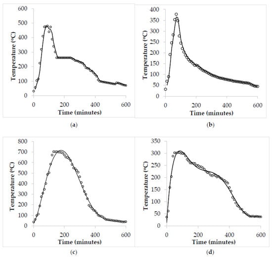 Temperature in the oil drum kiln: (a) corncob; (b) coconut husk; (c) coconut shell; and (d) rice straw.