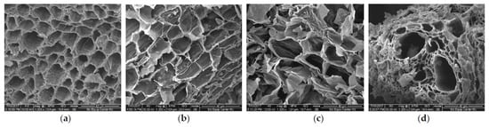 SEM images of the biochars (×1200 magnification): (a) corncorb; (b) coconut husk; (c) coconut shell; and (d) rice straw.