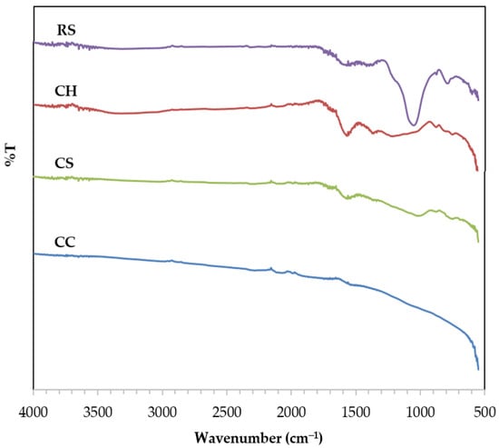 The FTIR spectra of biochar are presented in Figure 4. According to the results of Jouiad et al. [28], the bands assigned to O–H stretching (3200–3000 cm−1) and C–H stretching (3100–3000 cm−1) correspond to hemicellulose and cellulose, and the bands in the 900–1400 cm−1 range are representative of lignin. The mentioned band for hemicellulose and cellulose were absent in all biochar samples due to the decomposition of the raw biomass. A relatively small peak was found at 1362 cm−1 for CH biochar indicative of lignin (C–O group of carboxyl and alcohol). Broad bands at 1050 and 787 cm−1 were found in RS biochar due to the stretching of C–O–C and Si–O–Si groups, respectively. These peaks existed as there were strong chemical bonds [31]. The band intensity in the 1600 cm−1 region appeared indicative of conjugated C=C phenyl rings of ketones and quinones. This implies condensation of the biochar organic compounds which is in agreement with the results reported by other researchers [32,33,34]. Peaks for C–H bending bonds (out of plane) in the region of 900–675 cm−1, which are characteristic of the aromatic substitution pattern, were clearly visible for all biochars except for a small peak for the corncob biochar. Thus, the functional groups associated with the biochar surfaces were negative charges, with carbonyl and hydroxyl groups attached to highly aromatic structures. RS biochar also contained negative charges from silica. The highly negative surface charge of biochar gives it potential for heavy metal adsorption through various mechanisms such as cation exchange, electrostatic interactions, complexation, and precipitation onto biochar surfaces [35].
