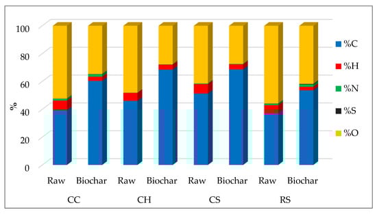The results of ultimate analysis (elemental C, H, N, S and O) of raw biomass and biochar samples are represented in Figure 5. It was revealed that biochars became more carbonaceous with the percentage of carbon ranging between 53.6 and 68.6%. From the percentage of each element, the molecular formula of the raw biomass samples were CH2O, CH1.5O0.8, CH1.6O0.6, and CH2O0.6 for CC, CH, CS, and RS, respectively. Then, the loss of hydrogen and oxygen during thermal conversion changed these molecular formulas to CH0.6O0.4, CH0.6O0.3, CH0.6O0.3, and CH0.6O0.6 for CC, CH, CS, and RS biochars, respectively. All biochar samples had lower H/C and O/C ratios than their parent raw biomass because of the loss of carbon and hydrogen into gases. Cellulose is the main structural component of cell walls and a linear molecule; hemicellulose is a two dimensional polymer molecule of xylan and glucomannan; and lignin is a three-dimensional macromolecule. There are hydrogen bonding and van der Waals forces among cellulose, hemicellulose, and lignin molecules [43]. During thermal conversion, various atoms form new bonds in new molecules of carbon dioxide, water, and other gases, and the formation of new bonds is an exothermic process in which heat is given off. The bond energy of C=O (CO2) is 803 kJ/mol. The O/C ratio decreased around 60% for corncob and coconut husk to biochars resulting in O/C ratios of 0.3. The low ratios indicate that the biochars have better fuel characteristics than the raw biomass. The O/C ratios of rice straw biochar was the highest at 0.6, resulting in the lowest heating value. In addition, biochars produced at higher temperatures haves lower O/C ratio, and the ratio correlates with high heating value [36,44]. The European Biochar Certificate (EBC) includes requirements that the molar ratios of O/C and H/C should be less than 0.4 and 0.7, respectively [45].