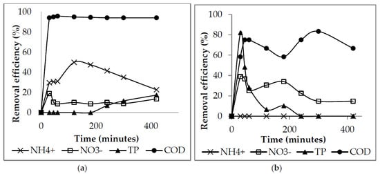 NH4+, NO3−, TP and COD removal efficiencies by biochar and sand filters. (a) Biochar filter and (b) sand filter.