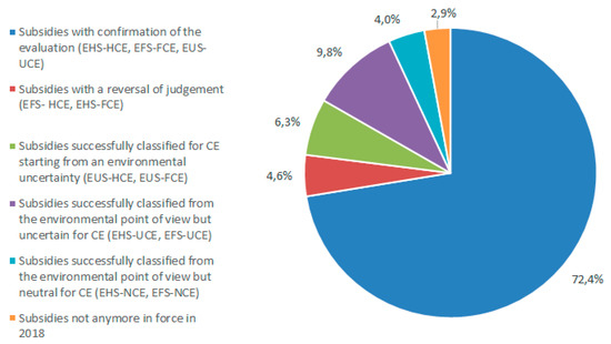 - neutral subsidies for the circular economy (NCE): subsidies that have no significant effects on the CE principles. This category has been added to prepare the subsequent comparison of results with the Catalogue. In fact, the category of neutral subsidies from the environmental point of view is implicit in the evaluation methodology of the Catalogue [19] (p. 129). The Catalogue’s assessment procedure starts with the preliminary selection of those existing subsidies that are potentially relevant for the environment, that are subsequently submitted for evaluation and classification within the Catalogue files;